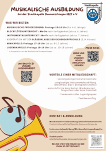 Die Stadtkapelle Donaueschingen freut sich, nach den kommenden Sommerferien wieder ein Angebot zur musikalischen Früherziehung für Kinder bereitzustellen. Der Unterricht beginnt ab dem neuen Schuljahr und findet immer freitags um 15:00 Uhr im Probelokal der Stadtkapelle statt. Ziel des Kurses ist es, Kinder im Vorschulalter spielerisch an Musik heranzuführen. Durch gemeinsames Singen, Musizieren mit... -